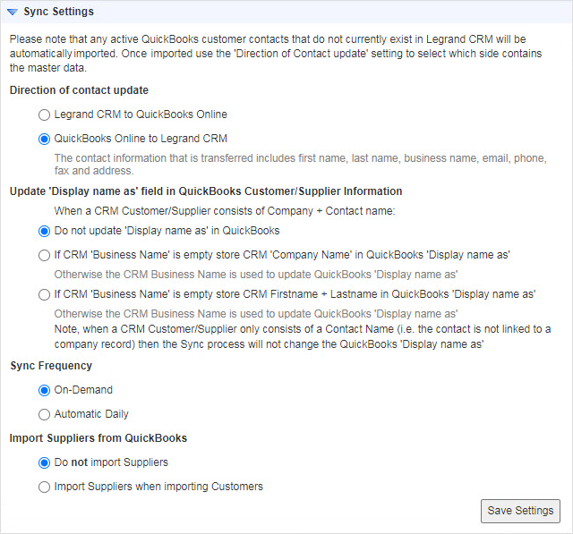 The default settings for contact updates are from QuickBooks Online to Legrand Cloud CRM. However, you can change the direction from Legrand CRM to QuickBooks Online. You can also decide whether to update the ‘Display name as’ field in QuickBooks, specify the sync frequency and whether you want to import suppliers into Legrand Cloud CRM.