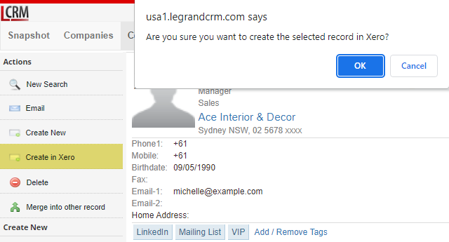 How to transfer Contacts from Legrand Cloud CRM into Xero Go to the Contacts module and select the contact. In the list of ‘Actions’, click ‘Create in Xero’ and ‘OK’ to confirm. Updated on 12 June 2024 Was this article helpful? Yes No Related Articles How to edit the Xero Sync Settings How to disconnect Xero from Legrand Cloud CRM How to view Xero transactions for a selected Contact in Legrand Cloud CRM How to import Xero Customers & Sales Transactions into Legrand Cloud CRM How to create a customer in Xero from Legrand Cloud CRM How to connect Legrand Cloud CRM with Xero Need Support?Can't find the answer you're looking for?Contact Support